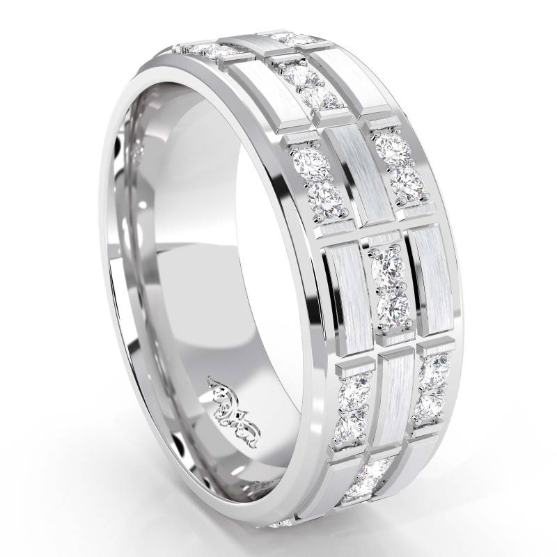 Designer classic style 3 row diamond eternity men's wedding band made in precious metal 14k white gold. Features 0.80 carat round diamonds in a micro pave setting with a touch of matte finish detailing. Available in 14k & 18k white gold, yellow gold, rose gold and platinum 950.