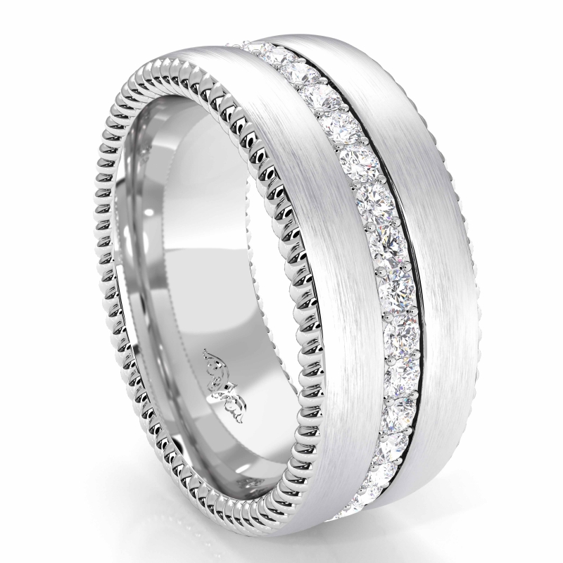Simple yet classy this matte finish diamond eternity men's wedding band crafted in 14k white gold. Features 1.10 carat round diamonds in a micro pave setting in center of matte finish side dome with polished rope edges. Available in 14k & 18k white gold, yellow gold, rose gold and platinum 950.