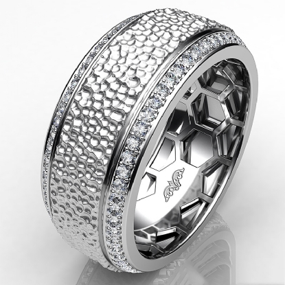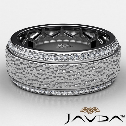 A stunning contemporary hammered finish diamond eternity men's wedding band made in 14k white gold. Features 1.00 carat round diamonds in a micro pave setting on edges and hammered finish center with a beautiful hexagon filigree inside. Available in 14k & 18k white gold, yellow gold, rose gold and platinum 950.