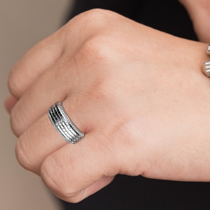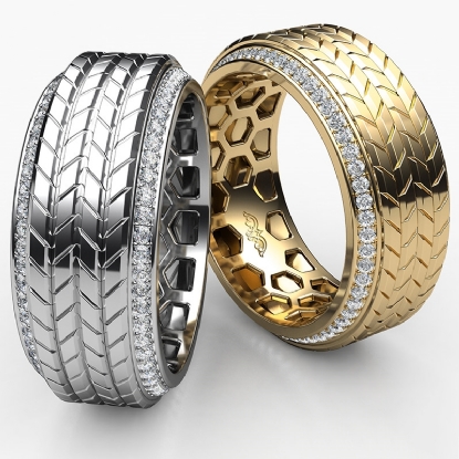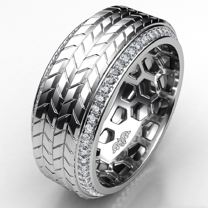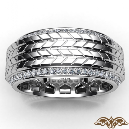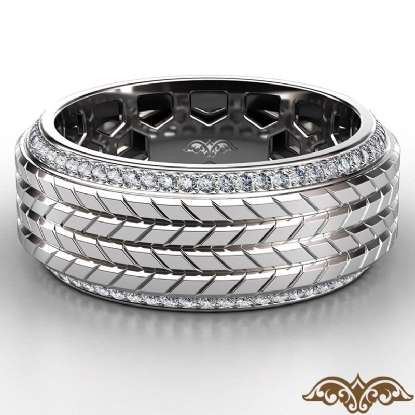 Remarkable grooved tyre tread men's diamond eternity wedding band made in 14k white gold. Features 0.60 carat round diamonds with center grooved in a tyre tread style, side diamonds in a micro pave setting on edges adding a modern flair. This handsome wedding band available in 14k & 18k white gold, yellow gold, rose gold and platinum 950.