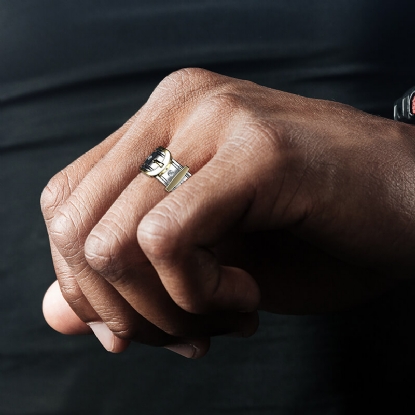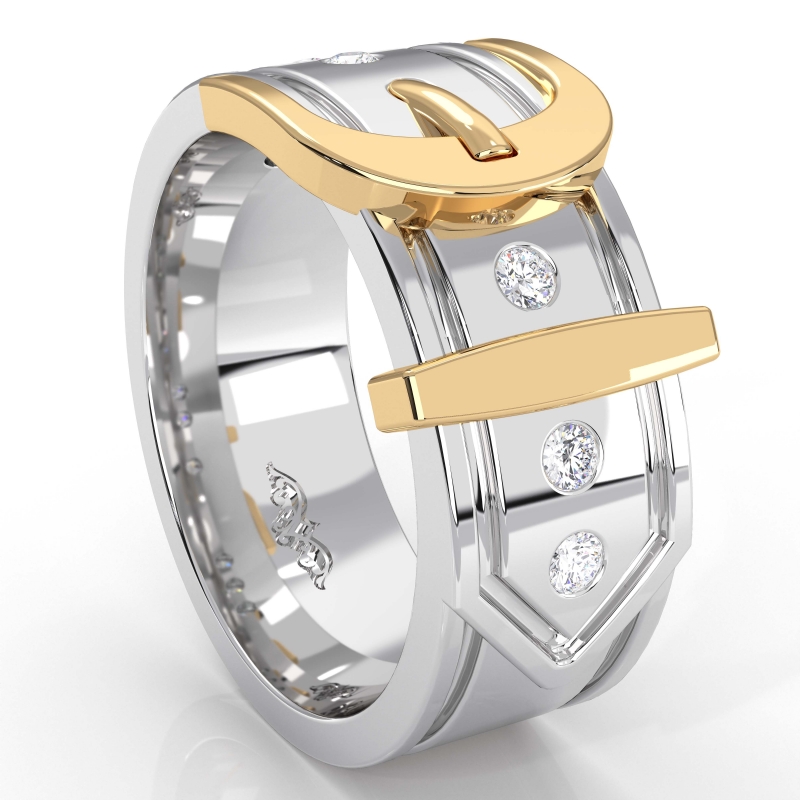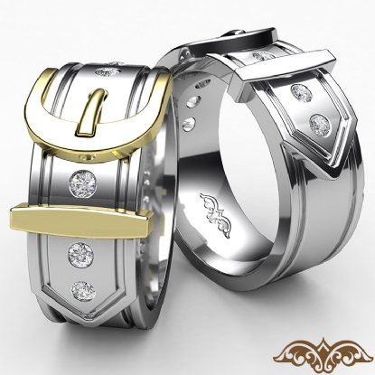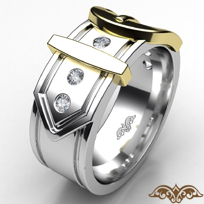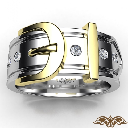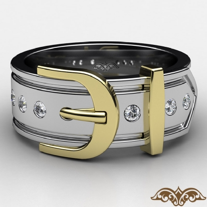 Amazing buckle design men's diamond wedding band handcrafted in polished finish 14k two tone gold. This unique piece features 0.20 carat round diamonds in a bezel setting on beautiful two tone belt buckle pattern. Available in 14k & 18k white gold, yellow gold, rose gold, two tone gold and platinum 950.