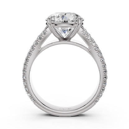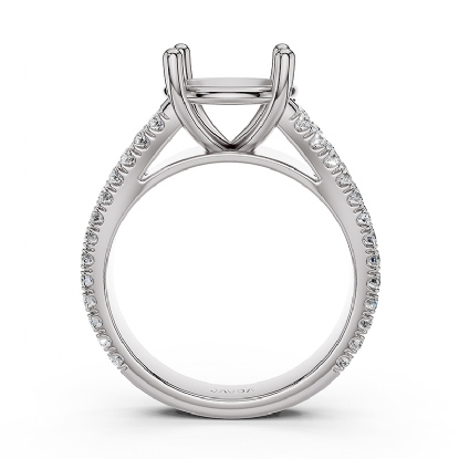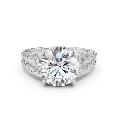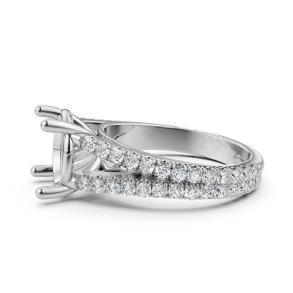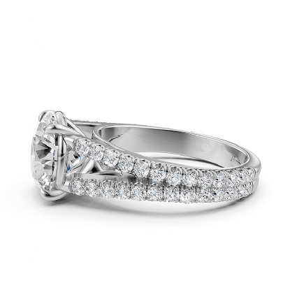 This split shank diamond engagement ring features a prong set round cut semi mount made from 14k white gold. Beautiful french U split pave set 0.70 carat side diamonds on shank add extra sparkle to this anniversary ring. Available in white gold, yellow gold, rose gold and platinum.