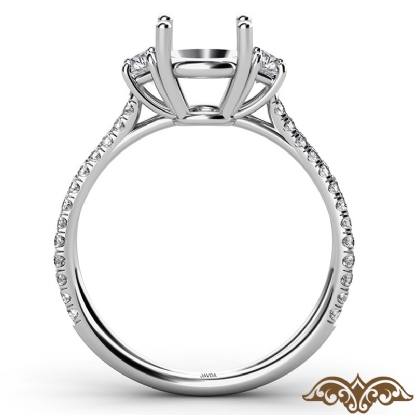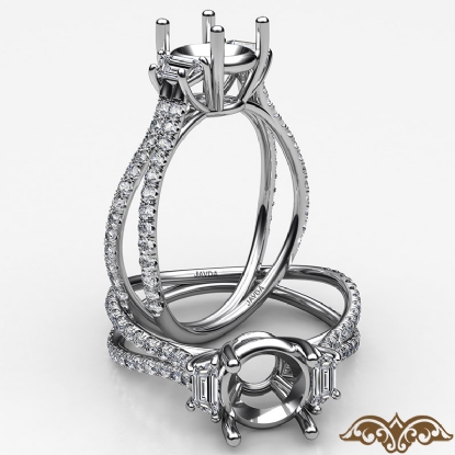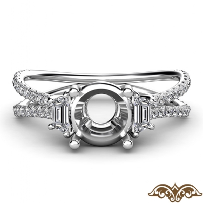 This three stone diamond engagement ring crafted in 14k white gold. This stylish ring features a split shank with french U split pave set 0.25 carat diamonds and round cut semi mount accented with 0.55 carat trapezoid diamonds made to hold on basket. Available in white gold, yellow gold, rose gold and platinum.