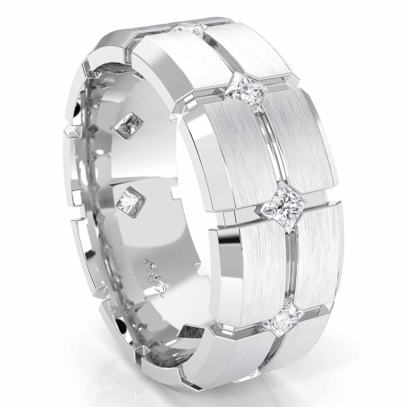 A modern design men's eternity princess diamond wedding band handcrafted in precious metal 14k white gold. This unique style wedding ring features 0.90 carat princess diamonds in a bezel setting beautifully set on polished grooved and matte surface with beveled edges. This comfort fit band available in 14k and 18k white gold, yellow gold, rose gold and platinum 950.