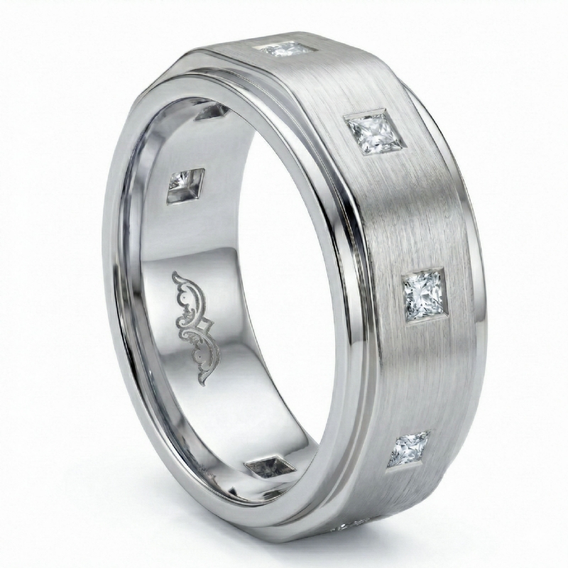 Stylish handmade matte finish men's diamond eternity wedding band made in 14k white gold. Showcasing bezel set 0.80 carat princess diamonds on matte finish surface with polished finish edges. We can make this wedding ring in all available metals like 14k & 18k white gold, yellow gold, rose gold, and platinum 950.