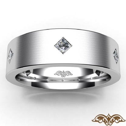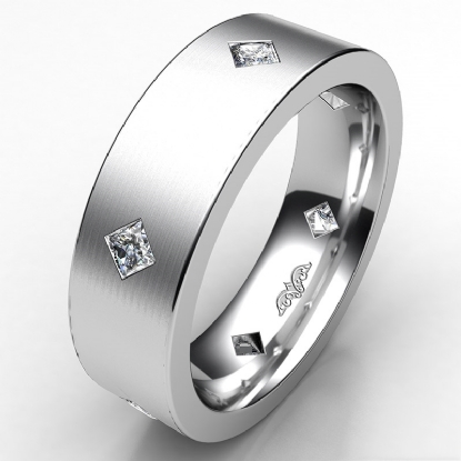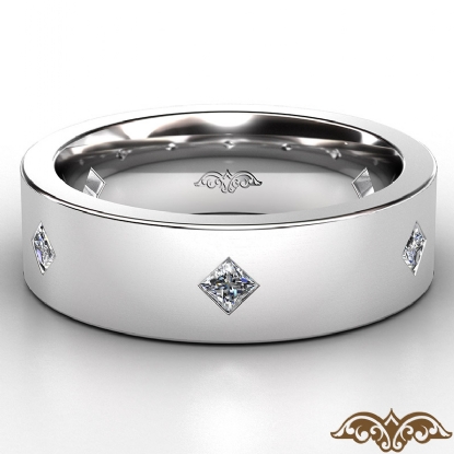 Simple and unique bezel diamond men's eternity wedding band made in 14k white gold. This wedding ring for men features 0.55 carat princess diamonds set on matte finish surface in a bezel setting with kite style. This classic wedding ring is available in 14k & 18k white gold, yellow gold, rose gold, and platinum 950.