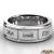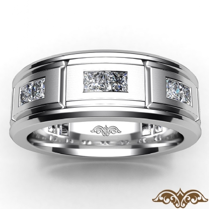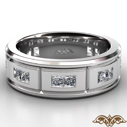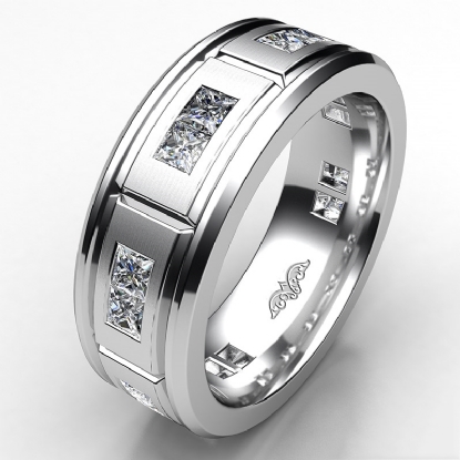 This eye catching modern men's diamond eternity wedding band handmade in 14k white gold. Features a beautiful polished grooved design and 1.44 carat princess diamonds on matte finish surface in a channel setting. This is a magnificent way to seal one's commitment, available in 14k & 18k white gold, yellow gold, rose gold, and platinum 950.