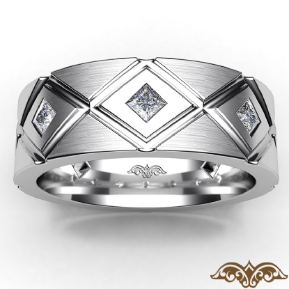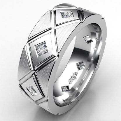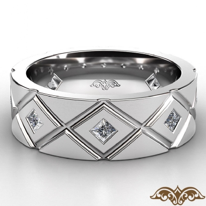 Designer diamond cut men's eternity princess diamond wedding band crafted in 14k white gold. This master piece features 0.60 carat princess diamonds in a bezel setting on matte finish and beautiful diamond cut grooved in a polished finish. This band for men is available in 14k and 18k white gold, yellow gold, rose gold and platinum 950.
