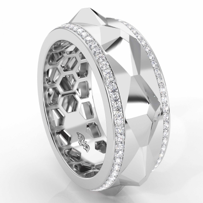 Unique and vintage style facet cut diamond eternity men's wedding band handmade in 14k white gold. This comfort fit wedding band features a polished finish facet cuts in a centre with 1 carat round diamonds in a micro pave setting on edge. Available in 14k & 18k white gold, yellow gold, rose gold and platinum 950.