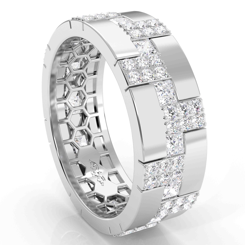 Dazzling diamond eternity men's wedding band expertly crafted in 14k white gold. Features 1.10 carat round diamonds in a micro pave set and 0.90 carat princess diamonds in a bezel setting, the alternative diamond settings makes this ring look more precious. This designer wedding ring available in 14k & 18k white gold, yellow gold, rose gold and platinum 950.
