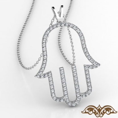 This spiritual hamsa hand women's diamond pendant necklace crafted in high quality 14k white gold. Features 0.35 carat round diamonds in a U cut pave setting, a perfect present for yourself, or someone special. This pendant is here to protect you from evil eyes and brings the wearer happiness, luck, health & good fortune, available in 14k & 18k white gold, yellow gold, rose gold and platinum 950. If you don't find your desired jewelry, please don't hesitate to contact our designer to make your custom jewelry design