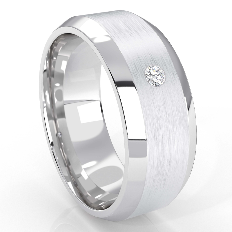 This comfort fit matte bezel set round diamond beveled edge men's wedding band handmade in 14k white gold. Features polished finish beveled edges and center matte finish with 0.05 carat single round diamond in bezel setting. Available in 14k & 18k white gold, yellow gold, rose gold and platinum 950. If you don't find your desired jewelry, please don't hesitate to contact our designer to make your custom jewelry design