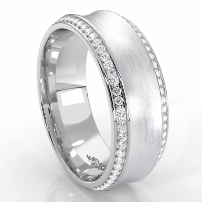 Elegant comfort fit matte finish concave round diamond eternity men's wedding band crafted in 14k white gold. Features center matte finish concave style with 0.75 carat round diamonds set in micropave setting on beveled edges. Available in 14k & 18k white gold, yellow gold, rose gold and platinum 950. If you don't find your desired jewelry, please don't hesitate to contact our designer to make your custom jewelry design