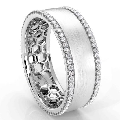 Unique piece of art, this matte finish honeycomb filigree round diamond eternity men's wedding band made in 14k white gold. This elegant ring features matte finish surface with the honeycomb filigree inside and 0.75 carat round diamonds in a split U pave setting on edges. Available in 14k & 18k white gold, yellow gold, rose gold and platinum 950. If you don't find your desired jewelry, please don't hesitate to contact our designer to make your custom jewelry design.