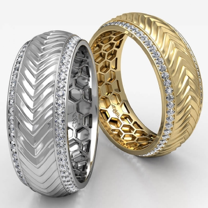 Stylish handmade harvest pattern round diamond eternity men's wedding band crafted in 14k white gold. Features polished finish center harvest pattern with honeycomb filigree inside and 0.75 carat round diamonds in a micropave setting on edges. Also available in 14k & 18k white gold, yellow gold, rose gold and platinum 950.