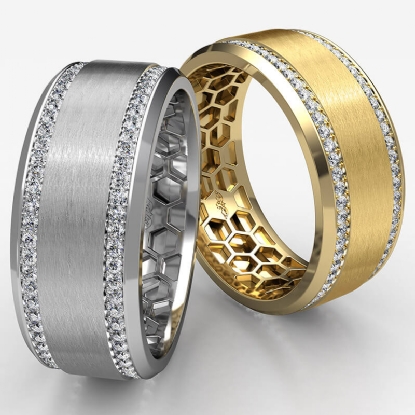 This classic and stylish matte finish beveled edges round diamond eternity men's wedding band crafted in 14k white gold. Features matte finish center and polished beveled edges with 0.75 carat round diamonds in a micropave setting on edges. Also available in 14k & 18k white gold, yellow gold, rose gold and platinum 950. If you don't find your desired jewelry, please don't hesitate to contact our designer to make your custom jewelry design.