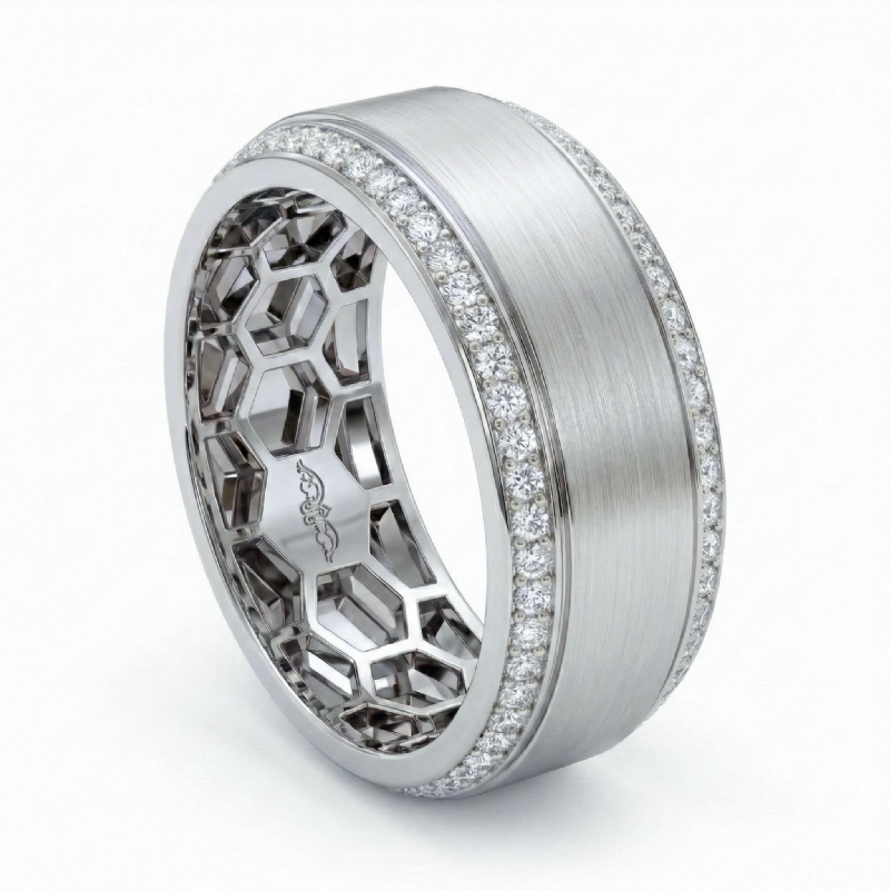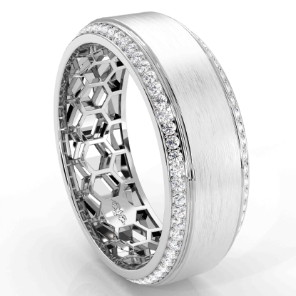 This modern classic honeycomb matte finish round diamond eternity men's wedding band made in 14k white gold. Features honeycomb filigree inside the band and center matte finished and a thin polished line on edges for a classic look, 0.75 carat round diamonds in a micropave setting on edges. Also available in 14k & 18k white gold, yellow gold, rose gold and platinum 950. If you don't find your desired jewelry, please don't hesitate to contact our designer to make your custom jewelry design.