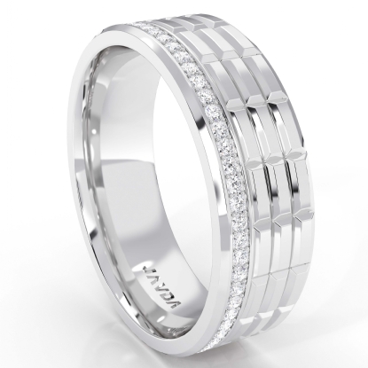 Modern brick pattern grooved round diamond men's eternity wedding band crafted in 14k white gold. This classic wedding ring features vertical & horizontal grooved with 0.60 carat round diamonds in a micro pave setting on one side of the edge. Also available in 14k & 18k white gold, yellow gold, rose gold, and platinum 950. If you don't find your desired jewelry, please don't hesitate to contact our designer to make your custom jewelry design.