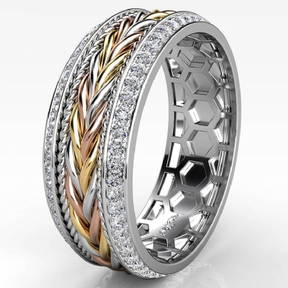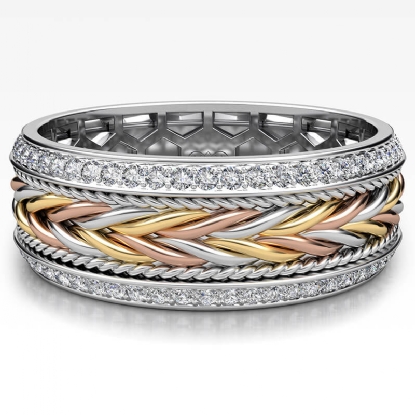 Handmade braided rope pattern round diamond eternity men's wedding band crafted in 14k trio color gold. This beautiful unique style ring features braided rope along the center in yellow, white, and rose gold with 1.00 carat round diamonds in a micro pave setting on beveled edges. Also available in 14k & 18k white gold, yellow gold, rose gold, trio color gold and platinum 950. If you don't find your desired jewelry, please don't hesitate to contact our designer to make your custom jewelry design.