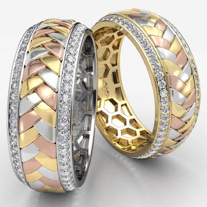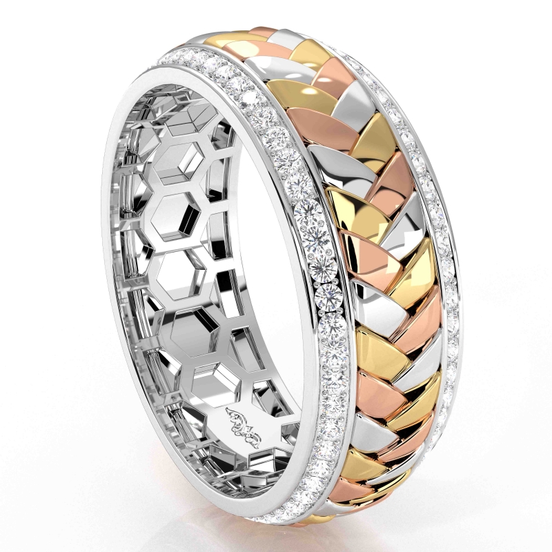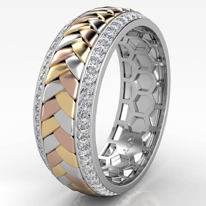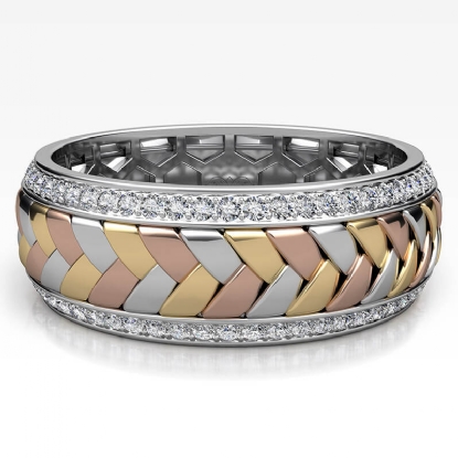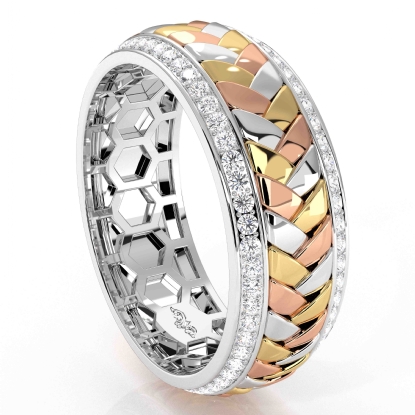 This elegant hand braided pattern round diamond eternity men's wedding band made in 14k trio color gold. Features stylish braided pattern along the center in yellow, white, and rose gold with 1.00 carat round diamonds in a micro pave setting on edges, making it a classic ring. Also available in 14k & 18k white gold, yellow gold, rose gold, trio color gold and platinum 950. If you don't find your desired jewelry, please don't hesitate to contact our designer to make your custom jewelry design.