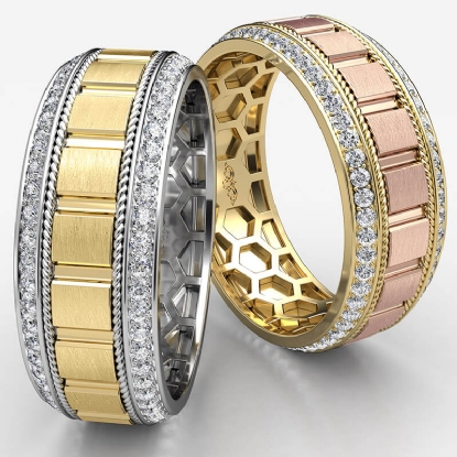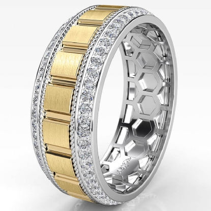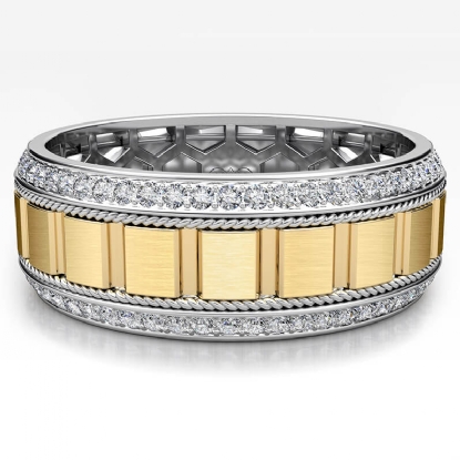 This luxurious designer matte finish round diamond eternity men's wedding band made in 14k two-tone gold. Features vertical cuts along the center in yellow gold and rope on sides of the ring in white gold with 0.90 carat round diamonds in a micro pave setting on beveled edges. This beautiful ring combines matte and high polished finishes for a stylish look, Also available in 14k & 18k white gold, yellow gold, rose gold, two-tone gold and platinum 950. If you don't find your desired jewelry, please don't hesitate to contact our designer to make your custom jewelry design.