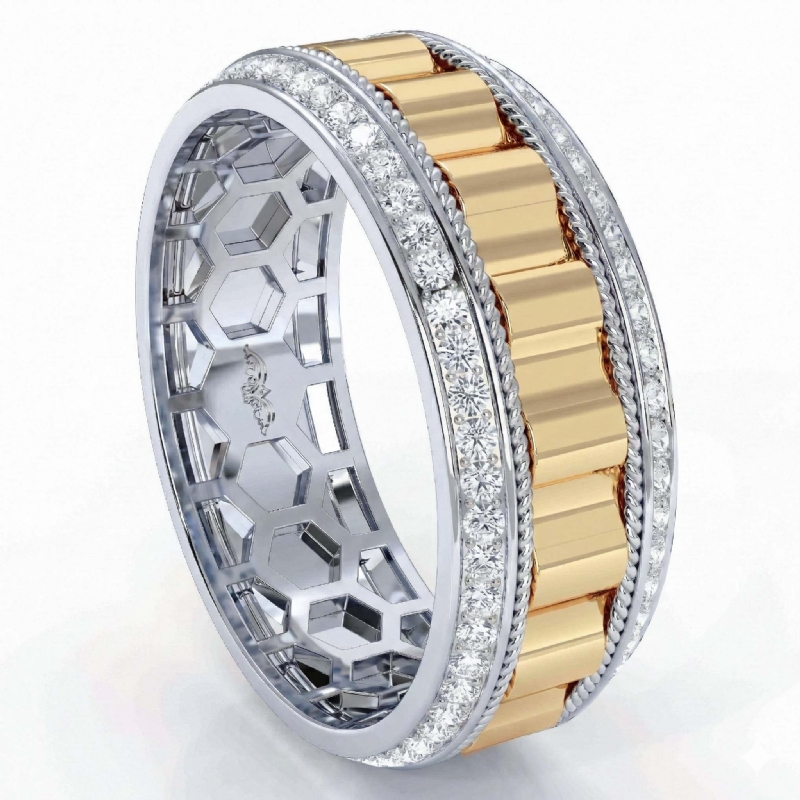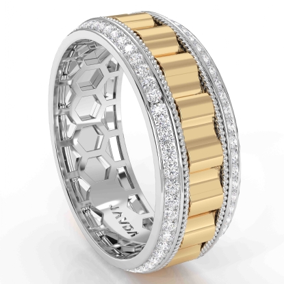This classic designer rope edge round diamond eternity men's wedding band crafted in 14k two-tone gold. Features polished finish luxurious pattern along the center in yellow gold and rope on sides of the ring in white gold with 0.90 carat round diamonds in a micro pave setting on beveled edges. Also available in 14k & 18k white gold, yellow gold, rose gold, two-tone gold and platinum 950. If you don't find your desired jewelry, please don't hesitate to contact our designer to make your custom jewelry design.