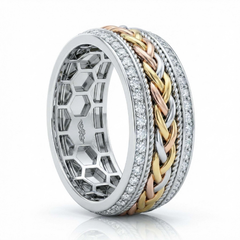 This beautifully polished rope braided beveled edge round diamond eternity men's wedding band made in 14k trio color gold. Features polished finish braided rope along the center in yellow, white, and rose gold with brilliant 0.90 carat round diamonds in a micro pave setting on beveled edges. Also available in 14k & 18k white gold, yellow gold, rose gold, trio color gold and platinum 950. If you don't find your desired jewelry, please don't hesitate to contact our designer to make your custom jewelry design.