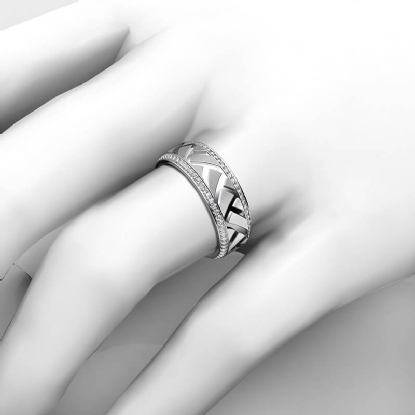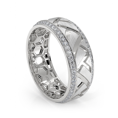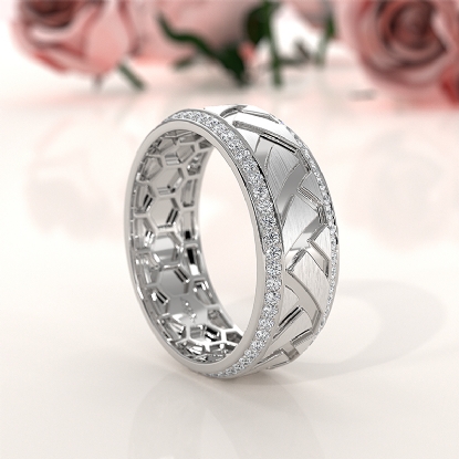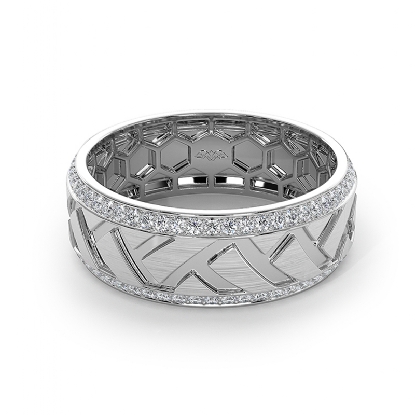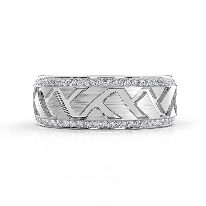 This elegant zig-zag center design round diamond eternity men's wedding band beautifully carved in 14k white gold. Features matte finish zig-zag design along the center with 0.90 carat round diamonds in a micro pave setting on the edges. Also available in 14k & 18k white gold, yellow gold, rose gold, and platinum 950. If you don't find your desired jewelry, please don't hesitate to contact our designer to make your custom jewelry design.