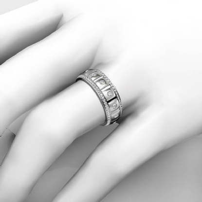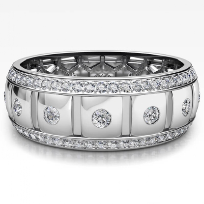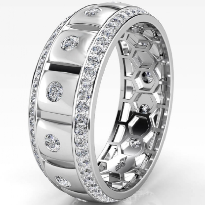 This comfort-fit bezel round diamond eternity men's wedding band handmade in 14k white gold. Features 0.50 carat round diamonds in a bezel setting and 0.72 carat round diamonds in a micro pave setting on the edges with vertical cuts and showcases honeycomb design inside the ring. Also available in 14k & 18k white gold, yellow gold, rose gold and platinum 950. If you don't find your desired jewelry, please don't hesitate to contact our designer to make your custom jewelry design.