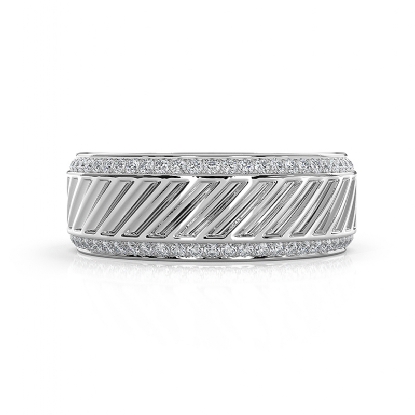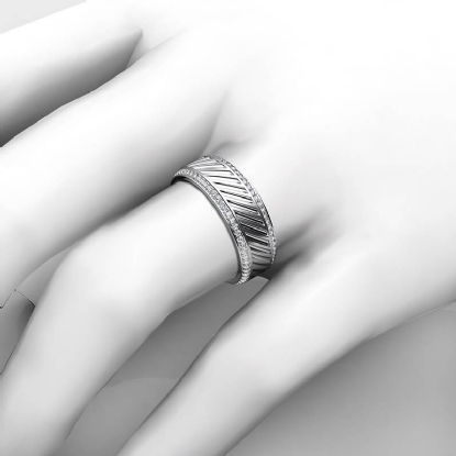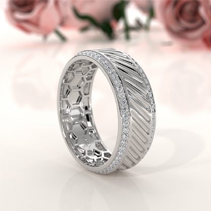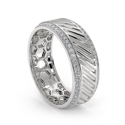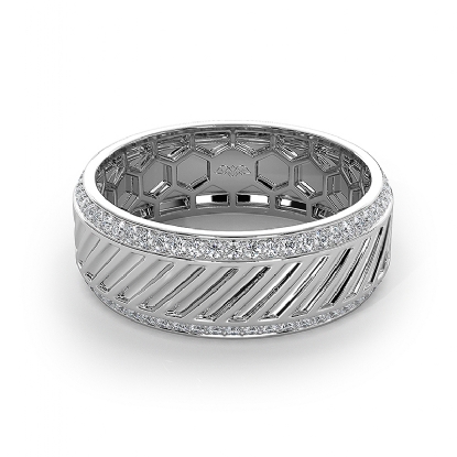Solid polished finish diagonal cut round diamond eternity men's wedding band crafted in 14k white gold. Present him on your Wedding day, this handsome ring features center diagonal cuts and 0.90 carat round diamonds in a micro pave setting on the edges and showcases honeycomb design inside the ring. Also available in 14k & 18k white gold, yellow gold, rose gold and platinum 950. If you don't find your desired jewelry, please don't hesitate to contact our designer to make your custom jewelry design.
