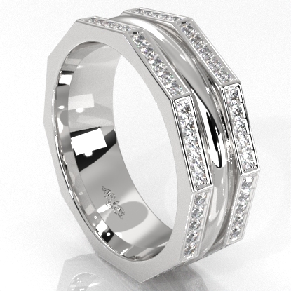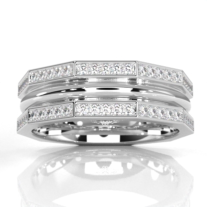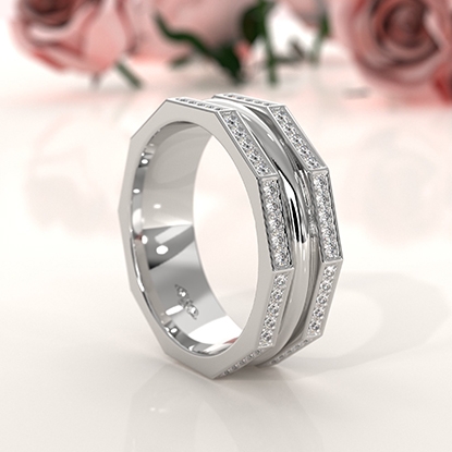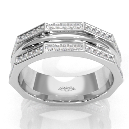 This handmade unique hexagonal style round diamond eternity men's wedding band made in 14k white gold. Features hexagonal sides with 0.80 carat round diamonds in a micro pave setting and polished finish center dome. This comfort-fit anniversary ring also available in 14k & 18k white gold, yellow gold, rose gold, and platinum 950. If you don't find your desired jewelry, please don't hesitate to contact our designer to make your custom jewelry design.
