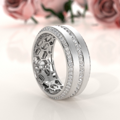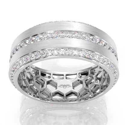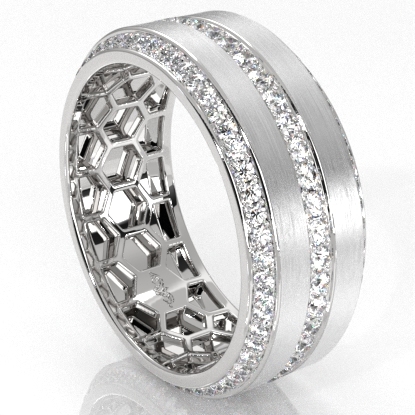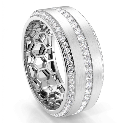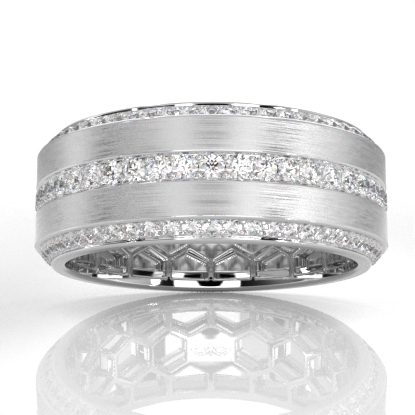 Present him on your wedding day this elegant matte finish 3 row round diamond eternity men's wedding band made in 14k White Gold. This luxurious ring features a matte finish center with 1.70 carat round diamonds in a micro pave setting on the edges and center showcases honeycomb design inside the ring. Also available in 14k & 18k white gold, yellow gold, rose gold, and platinum 950. If you don't find your desired jewelry, please don't hesitate to contact our designer to make your custom jewelry design.