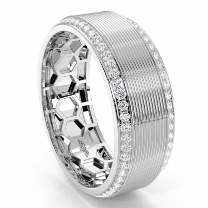This classic and stylish polished finish center grooved round diamond eternity men's wedding band crafted in high quality 14k white gold. Features polished finish center grooved with 1.2 carat round diamonds in a micro pave setting on edges and showcases honeycomb design inside the ring. Also available in 14k & 18k white gold, yellow gold, rose gold and platinum 950. If you don't find your desired jewelry, please don't hesitate to contact our designer to make your custom jewelry design.