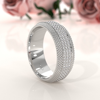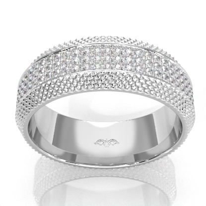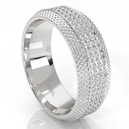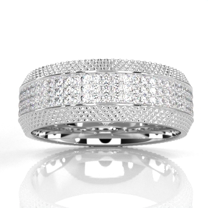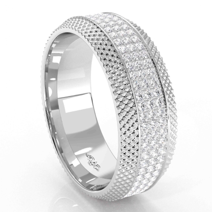 This latest design comfort fit diamond cut men's eternity wedding band crafted in high quality 14k white gold. Features 1.2 carat round diamonds in a micro pave setting with stunning diamond cuts on edges, gift this to the man you love. This luxurious ring is also available in 14k & 18k white gold, yellow gold, rose gold, and platinum 950. If you don't find your desired jewelry, please don't hesitate to contact our designer to make your custom jewelry design.