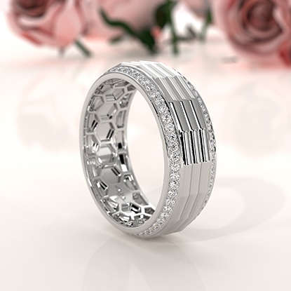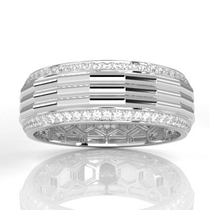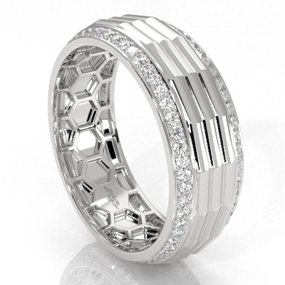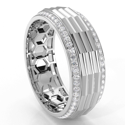 Unique style octagon grooved round diamond eternity men's wedding band handcrafted in 14k white gold. Luxury with style, this classic ring features polished finish octagon grooved center with 0.90 carat round diamonds in a micro pave setting on the edges with honeycomb design inside the ring. Also available in 14k & 18k white gold, yellow gold, rose gold, two-tone gold and platinum 950. If you don't find your desired jewelry, please don't hesitate to contact our designer to make your custom jewelry design.