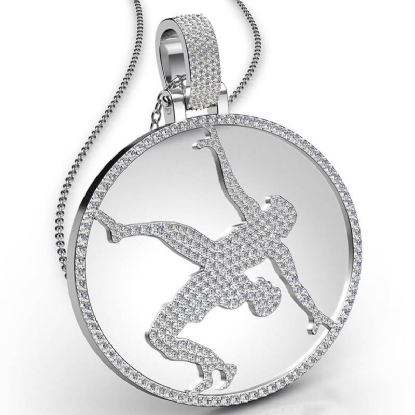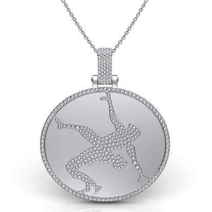 This custom glamorous couple diamond pendant handcrafted in 14k white gold. Elegant circle diamond pendant showcases 4.00 carat diamonds surrounding pendant with couple along the center secured with diamond bail and 18 inches rolo chain. If you don't find your desired jewelry, please don't hesitate to contact our designer to make your custom jewelry design