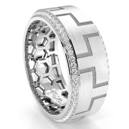 Sophisticated yet classic this carved design diamond eternity men's wedding band skillfully crafted in 14k white gold. This beautiful ring showcases 0.90 carat round diamonds on edges in a micro pave setting and matte finish along the center. Also available in 14k & 18k white gold, yellow gold, rose gold and platinum 950. If you don't find your desired jewelry, please don't hesitate to contact our designer to make your custom jewelry design