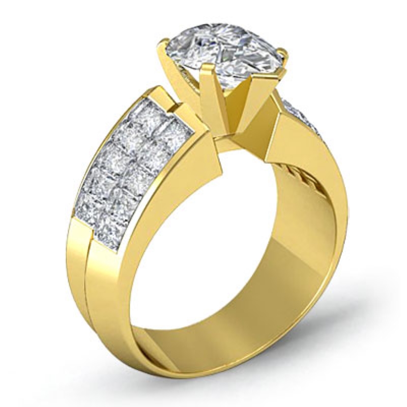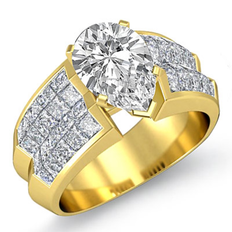 Classic Side Stone Invisible style Engagement Ring, center is Pear shape Diamond Report by GIA, I Color & SI2 clarity, Made in 18k Yellow Gold (2.63 ct. tw.)