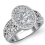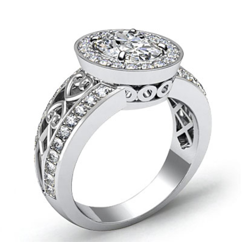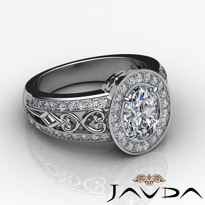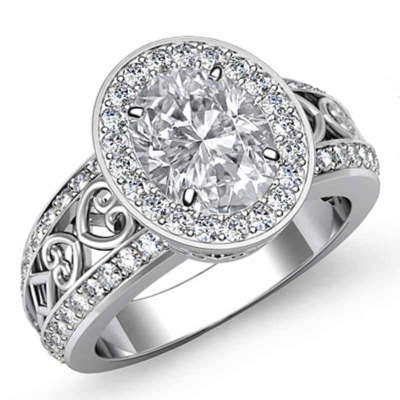 Halo Pave Filigree Shank style Engagement Ring, center is Oval shape Diamond Report by GIA, F Color & SI2 clarity, Made in Platinum 950 (1.65 ct. tw.)