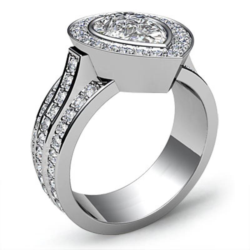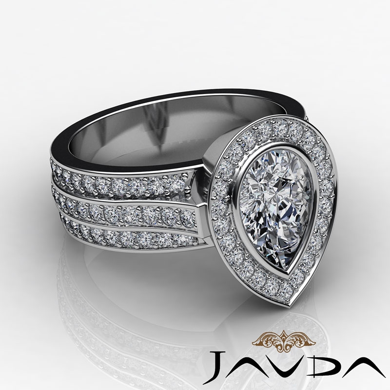 3 Row Shank Bezel Halo style Engagement Ring, center is Pear shape Diamond Report by GIA, D Color & SI1 clarity, Made in 18k White Gold (2.45 ct. tw.)