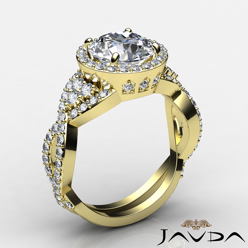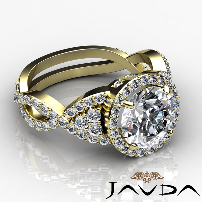 Halo Pave Criss Cross Shank style Engagement Ring, center is Round shape Diamond Report by GIA, I Color & SI1 clarity, Made in 18k Yellow Gold (2.46 ct. tw.)