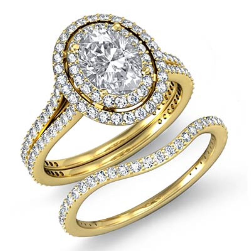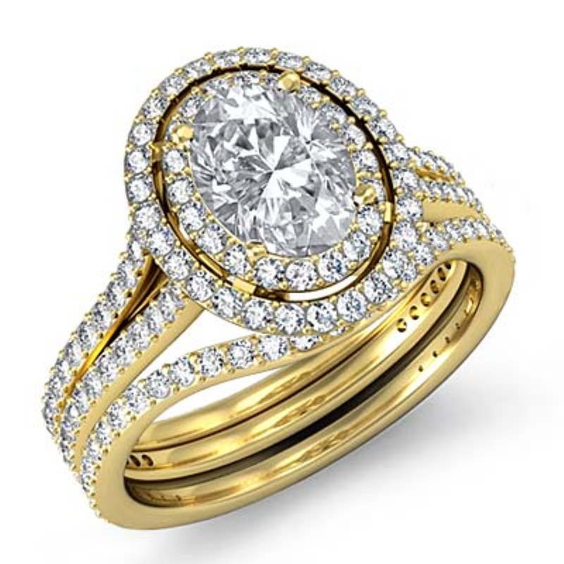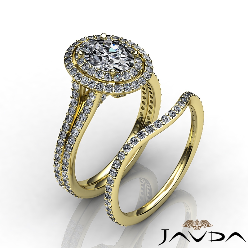 Double Halo Bridal Set style Engagement Ring, center is Oval shape Diamond Report by GIA, F Color & SI2 clarity, Made in 14k Yellow Gold (2.9 ct. tw.)
