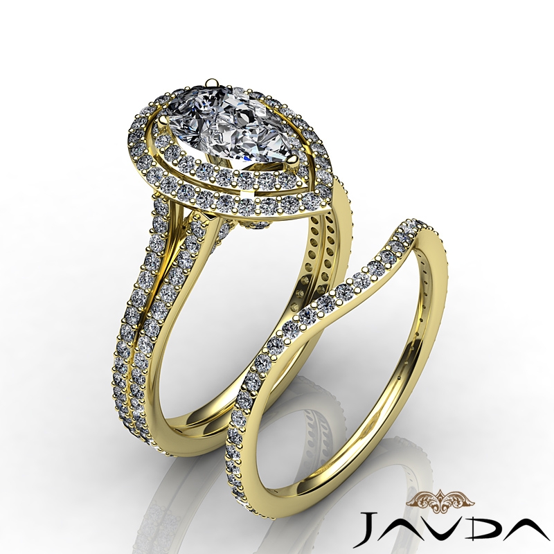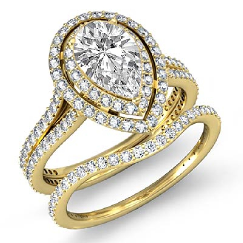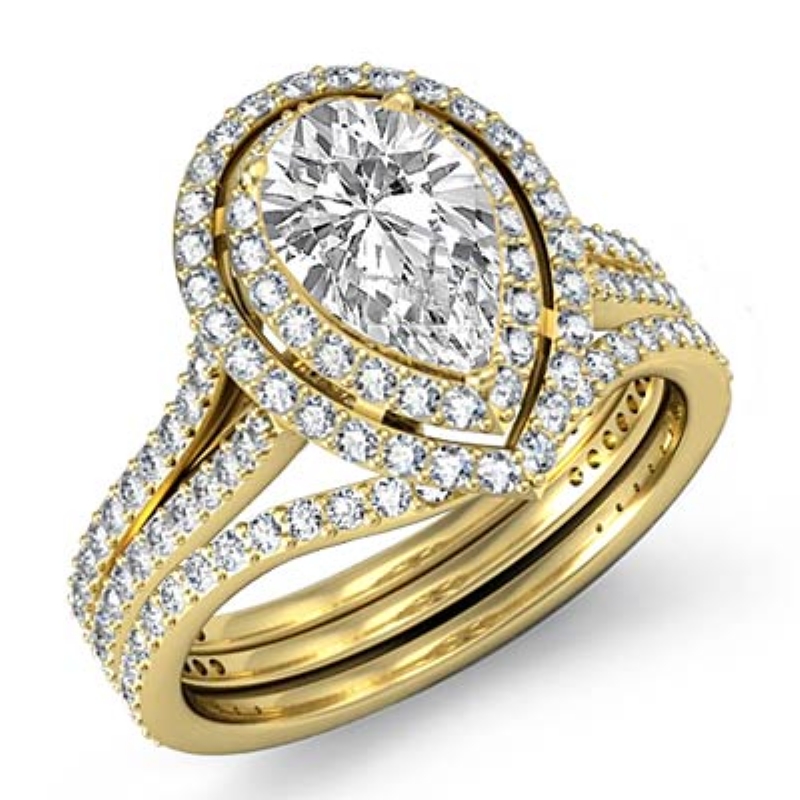 Gala Halo Pave Bridal Set style Engagement Ring, center is Pear shape Diamond Report by GIA, I Color & SI2 clarity, Made in 18k Yellow Gold (3.11 ct. tw.)