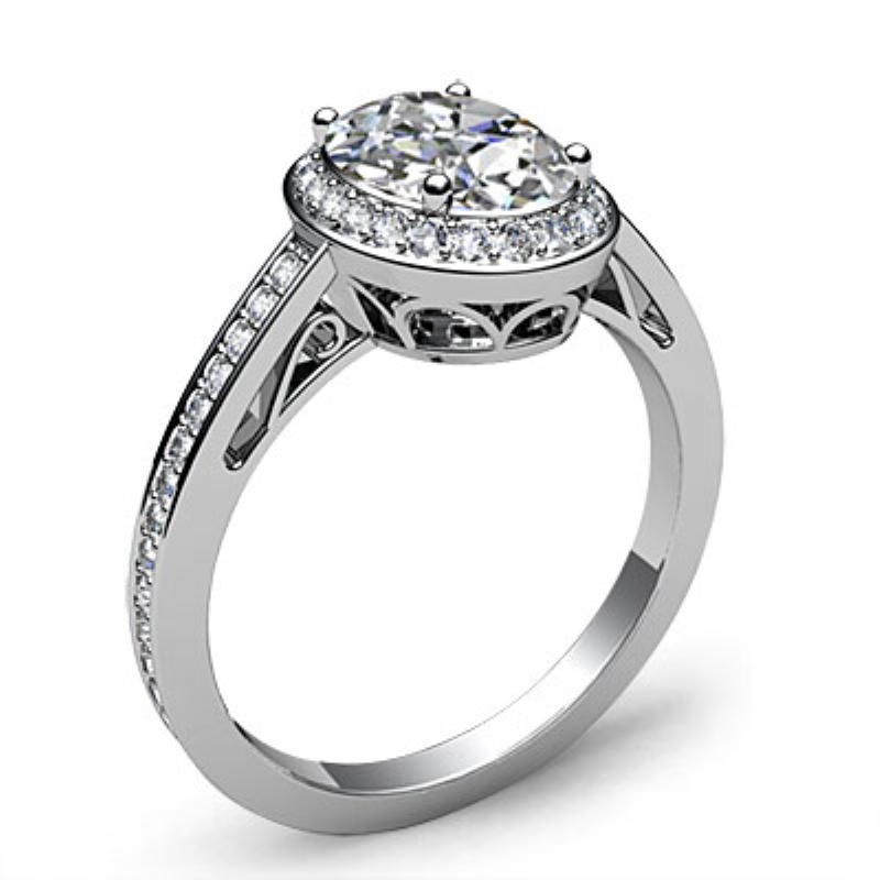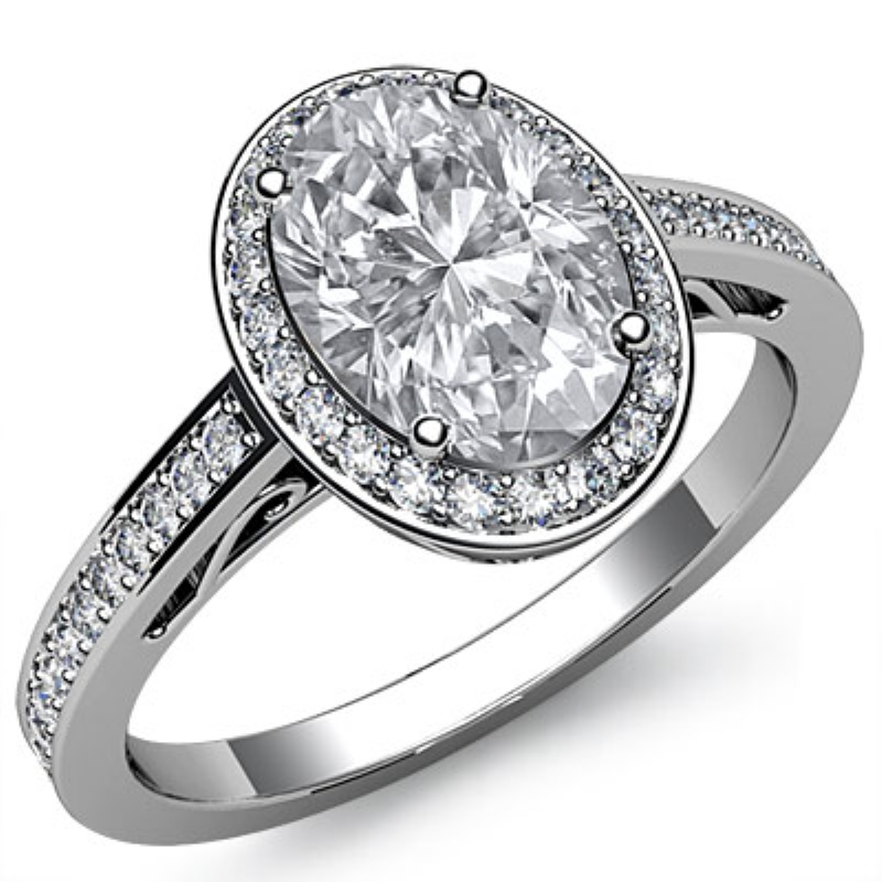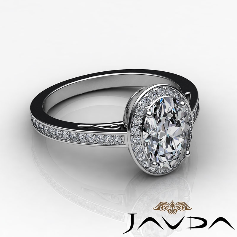 Halo Pave Sidestone Filigree style Engagement Ring, center is Oval shape Diamond Report by GIA, F Color & SI2 clarity, Made in 14k White Gold (1.4 ct. tw.)